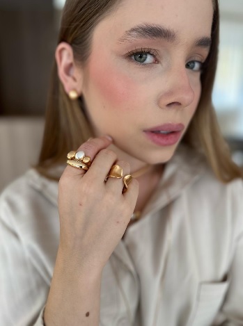 Anel duplo com um design que valoriza volumes e formas. Ele se destaca por unir duas estéticas em uma única peça, criando um visual de camadas (layering).