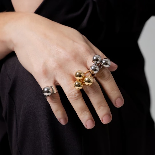 Este trio de anéis grande é uma declaração de estilo imponente e sofisticado. Cada anel é habilmente confeccionado em metal polido de alta qualidade, destacando-se pela presença marcante de uma esfera elegante como detalhe central. A esfera... Ver mais