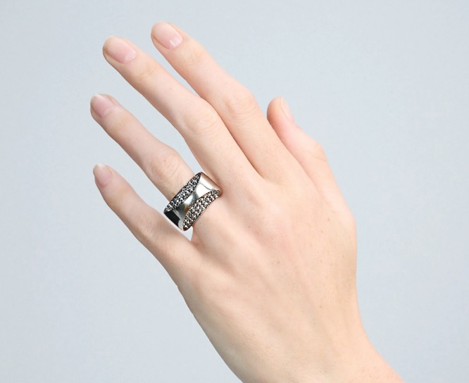 O Anel Op Art foi produzido artesanalmente, aplicando as técnicas da joalheria, no banho Prata Boho, com70 cristais cravejados manualmente.