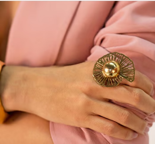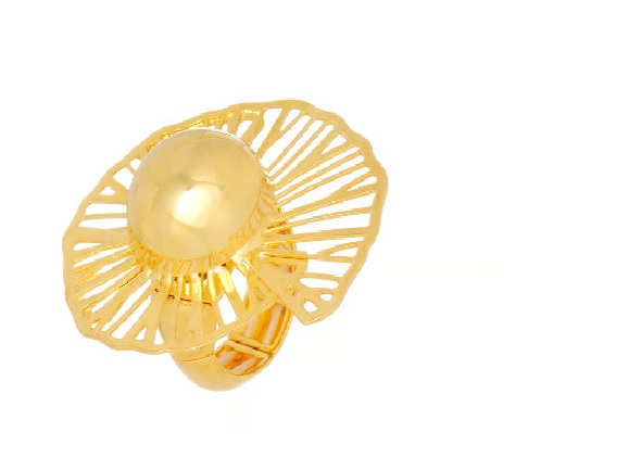 Anel em Metal no banho Ouro Vintage, regulável por silicone com meia bola e placa em aspiral.