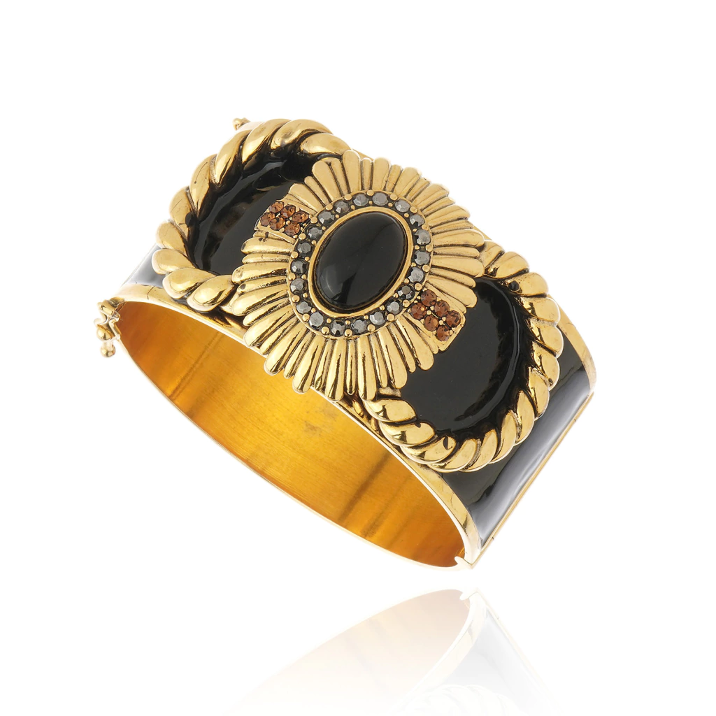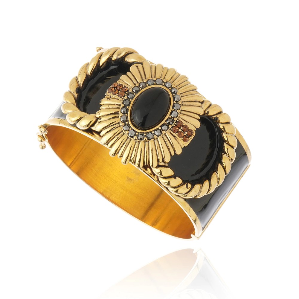 Banhado em ouro vintage e com esmaltação em preto, esse bracelete é de extrema discrição e elegância. A aplicação de cristais em tons neutros complementa o design único da peça.
