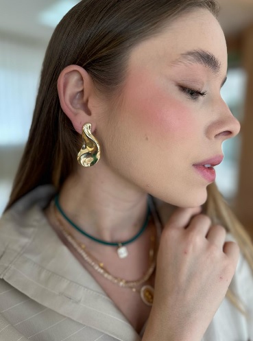 Brinco em banho de ouro 18k, em formato orgânico, escultural com curvas suaves, inspirado em elementos da natureza, em Tamanho médio.