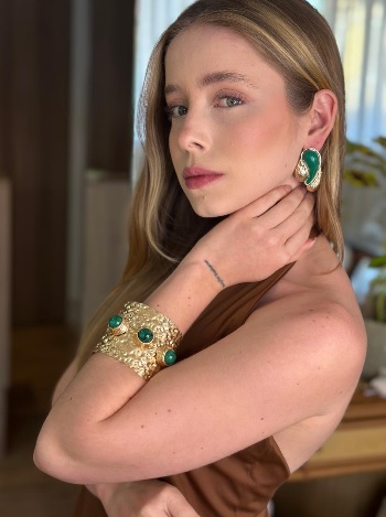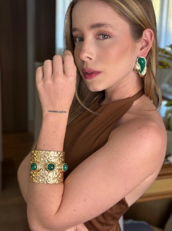 Brinco Orgânica Gota Verde bijuteria com design em formato de gota, com contornos fluidos que capturam a essência de uma gota de orvalho. Tamanho médio, perfeita para unir elegância e movimento.